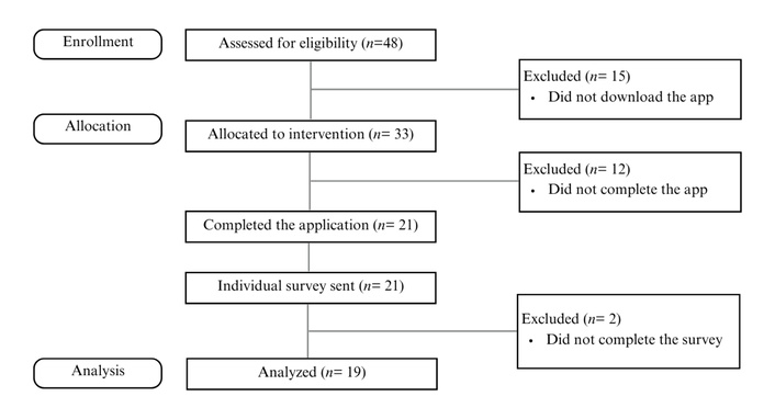 Of the 48 participants who expressed interest in participating, 31.3% (15/48) were excluded for not downloading the app, while 68.8% (33/48) were enrolled in the intervention (Figure 2). Of those 33 participants, 63.6% (21/33) completed the app, whereas 36.4% (12/33) were excluded for not completing the missions or the post-intervention assessment. The individual survey was sent to those who completed the app (21/33), of whom 9.5% (2/21) did not respond. Therefore, the final sample consisted of 19 participants.