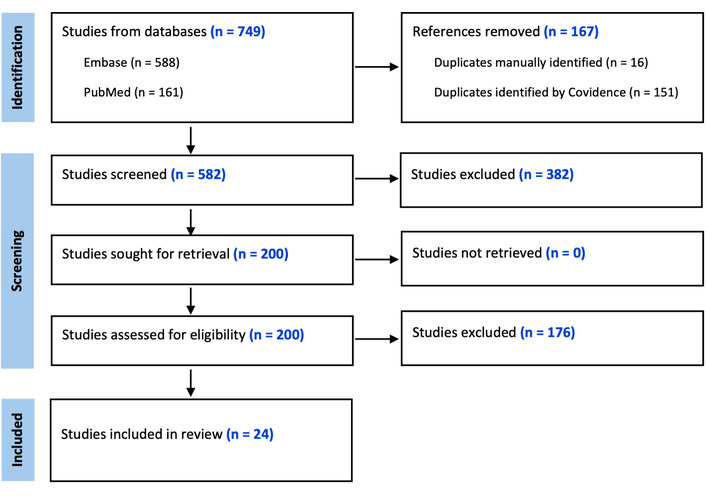 The initial search identified 749 studies, with 167 duplicates removed. The remaining 582 articles were screened by title and abstract, resulting in 200 full-text articles for review. After applying inclusion/exclusion criteria, 24 studies were included in the final analysis. The PRISMA flowchart (Figure 1) illustrates the selection process.