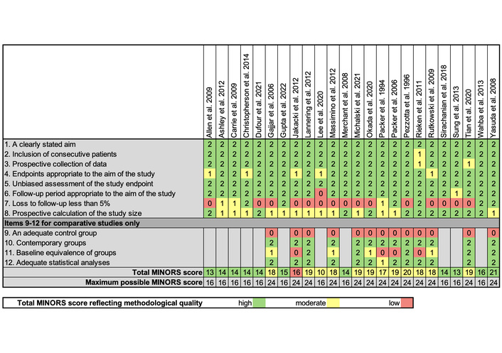 Study quality was assessed using the methodological index for non-randomized studies (MINORS) checklist. The MINORS items are scored 0 (not reported), 1 (reported but inadequate), or 2 (reported and adequate), with a maximum possible score of 16 for non-comparative studies (from eight categories) and 24 for comparative studies (from 12 categories). The methodological quality of each study was determined based on the overall MINORS score. The methodological quality was considered low if the MINORS score was 0 to 8 (0 to 16 for comparative studies), moderate if scored 9 to 12 (17 to 20 for comparative studies), and high if scored 13 to 16 (21 to 24 for comparative studies).