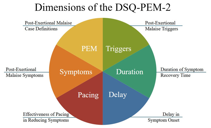 Our prior 10-item DSQ-PEM instrument [22] did not assess several important PEM domains, including the delayed onset of symptoms or PEM triggers, and our more comprehensive DPEMQ was extremely long and did not contain summary scores of the total PEM burden to a participant. The newly created DSQ-PEM-2 is a briefer, yet comprehensive measure of PEM that includes both a PEM screener, the major PEM triggers, the duration of PEM, the delayed onset of PEM, pacing and other efforts that might reduce PEM, major PEM symptoms, and the frequency and severity of PEM. This scale can be completed in 10 minutes and thus can be used by clinicians and researchers for multiple purposes.